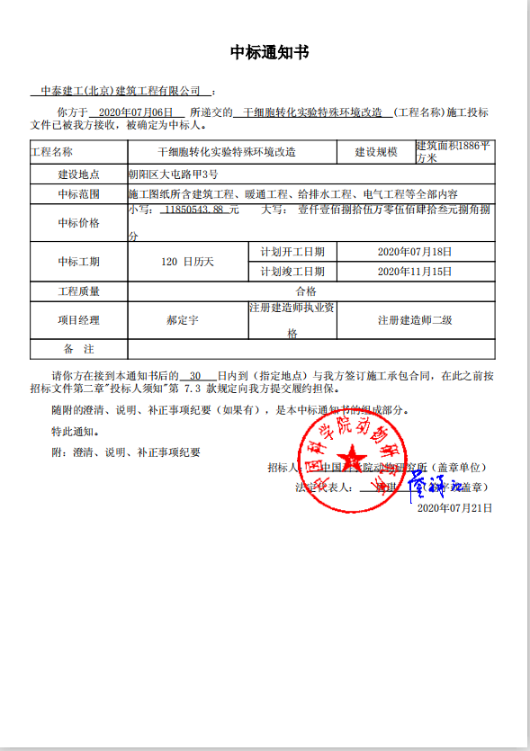 威尼斯人博彩喜讯不断,捷报连连,成功中标「中国科学院动物研究所干细胞实验室净化工程项目」。